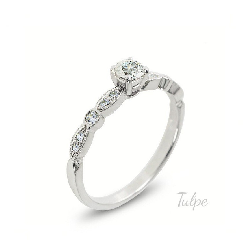 Fehér arany női gyűrű, kisebb és nagyobb kövekkel díszítve, a nagyobb középső kő körül.