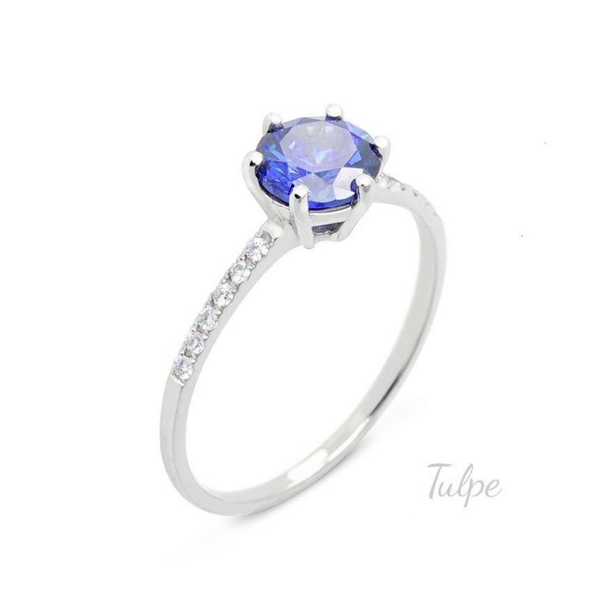 A fehérarany mutatós eljegyzési gyűrű tanzanit cirkóniával és 12 darab 1.10 mm-es gyémánttal.
