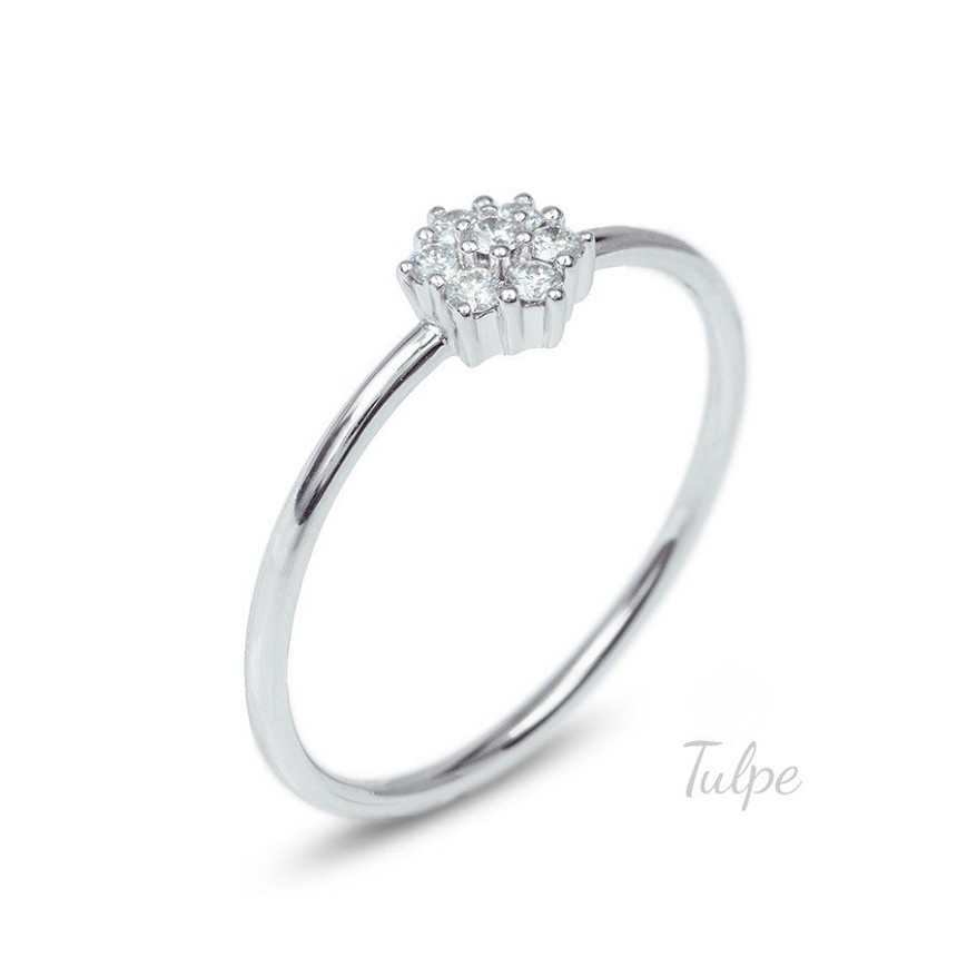 Elegáns fehérarany női gyűrű. A virág alakú fejrészbe 7 db. csillogó 1.50 mm-es gyémánt került, gondos kézi munkával befoglalva.
