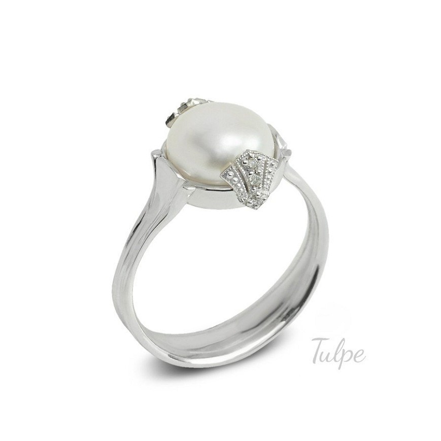 Elegáns, mutatós fehérarany női gyűrű, mely középre 10 mm Mabe gyöngyöt foglaltunk az apró gyémántok közé. A gyűrűn lefutó gyémántok egy csillogó kősort alkotnak.