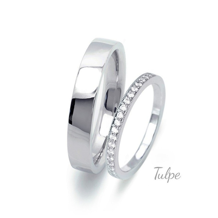 Lapos fazonú karikagyűrű pár, melynél a női gyűrűt ragyogó kövekkel díszítettük. A két darab különbözik,de mégis egy pár. A Tulpe Ékszer minden darabja személyre szóló tervezés után készül.