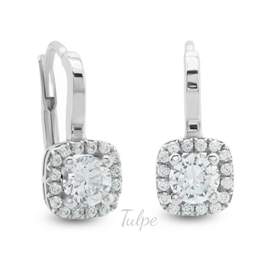Arany fülbevaló biztonságos patent zárral. A középső nagyobb követ, apró kövek veszik körül. Karmazált, eternity foglalás, körbe köves kollekció része.